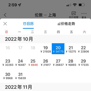 中新经纬在携程上搜索伦敦至上海的机票,10月和11月的价格普遍在2万元左右,少数日期有万元内的机票。