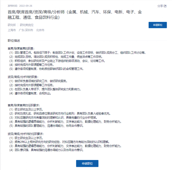 值得关注的是,近期海通证券研究类多个岗位正在招聘当中。9月26日,海通证券官网招聘信息显示,其金属、机械、汽车、环保、电新、电子、金融工程、通信、食品饮料行业正在招聘首席/联席首席/资深/高级/分析师。