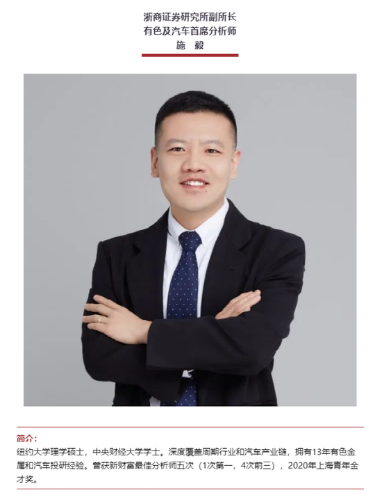 据浙商证券介绍,施毅系纽约大学理学硕士,中央财经大学学士。深度覆盖周期行业和汽车产业链,拥有13年有色金属和汽车投研经验。曾获新财富最佳分析师五次(1次第一,4次前三),2020年上海青年金才奖。