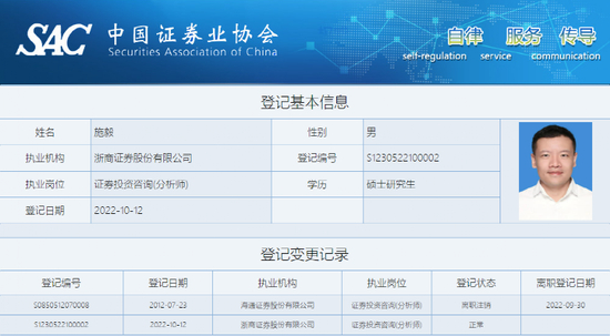 中证协信息显示,施毅于2012年7月在海通证券取得证券投资咨询执业资格,在今年9月30日办理离职登记手续。10月12日,施毅在浙商证券重新完成执业登记。