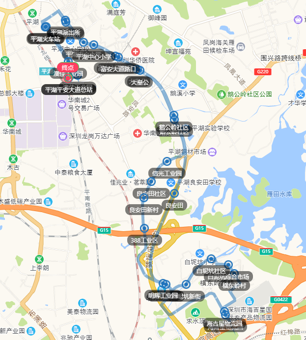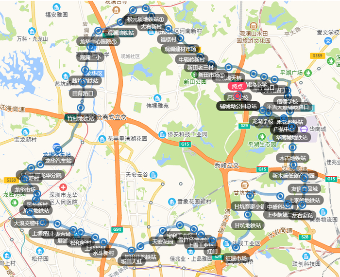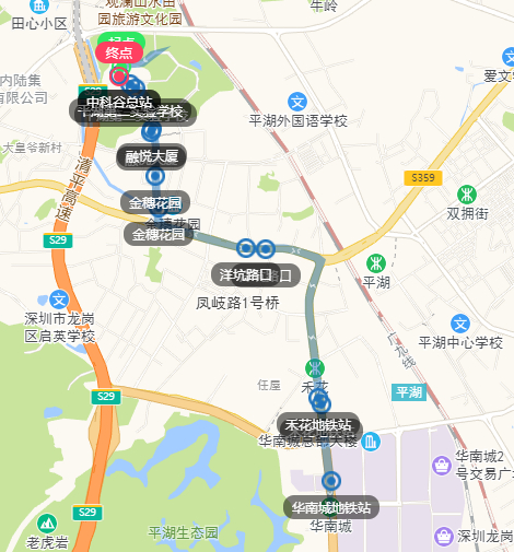 中科谷总站、平湖第二实验学校、融悦大厦、金穗花园、洋坑路口、禾花地铁站、华南城地铁站、禾花地铁站、洋坑路口、金穗花园、融悦大厦、平湖第二实验学校、中科谷总站