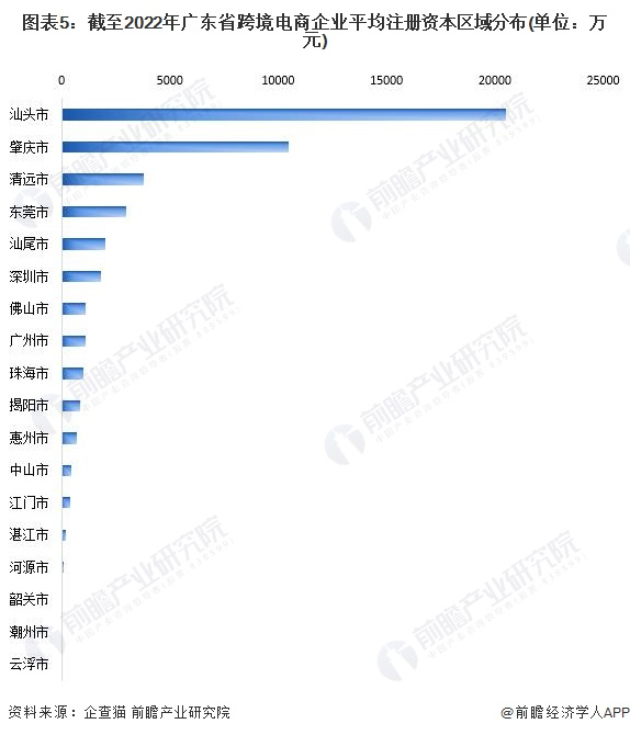根据中国企业数据库企查猫,目前广东省跨境电商企业的平均注册资本区域分布中,汕头市相关企业的平均注册资本最高为20510万元,除此外,肇庆市的跨境电商企业平均注册规模也在1亿元以上,规模相对较大。