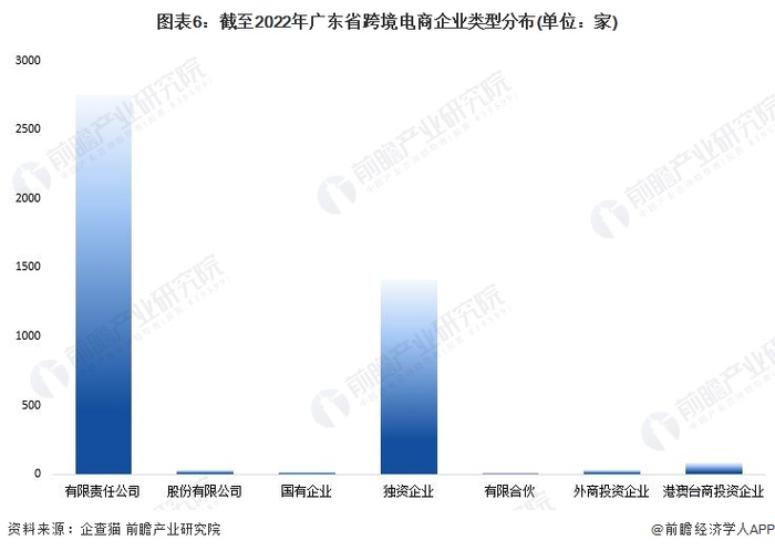 根据中国企业数据库企查猫,目前广东省存续和在业的跨境电商企业共2857家。广东省跨境电商企业以有限责任公司为主,目前共有2750家,其次为独资企业的1413家。