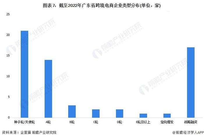 根据中国企业数据库企查猫,目前广东省跨境电商行业企业融资规模较小,存续和在业的企业共2857家,其中共有61家企业有融资信息,而其中以种子轮、战略融资和A轮为主。截至2022年广东省跨境电商企业中,有21家企业为融资为种子轮/天使轮,17家企业为战略融资,14家企业为A轮融资。