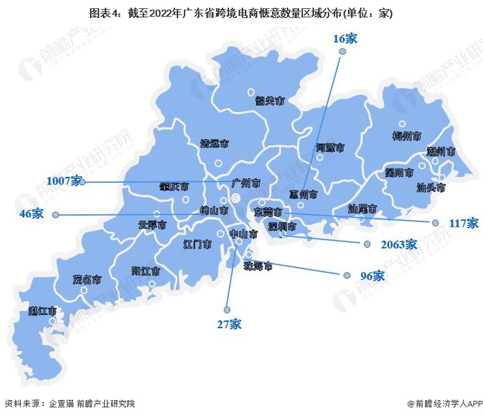根据中国企业数据库企查猫,目前广东省跨境电商企业主要分布在广州和深圳两地。截至2022年9月底,深圳市共有相关跨境电商企业数2063家,广州市则有1007家。