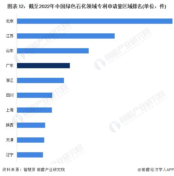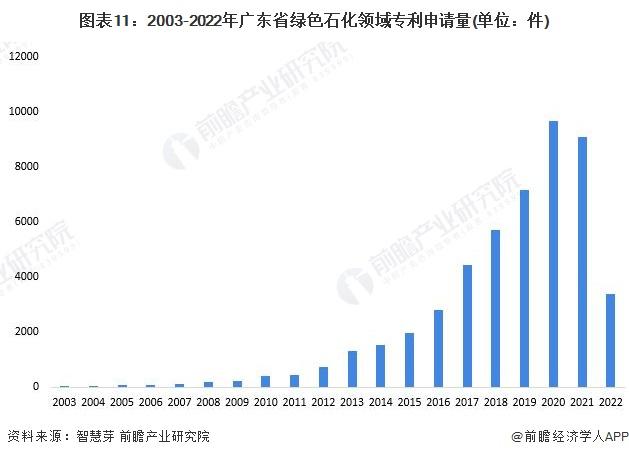 广东省十分注重石化产业技术创新,研发能力持续提高。根据智慧芽查询数据显示,自2014年起,广东省绿色石化领域专利申请量快速增长,2017-2021年历年专利申请量均突破4000件。截至2022年10月12日,广东省绿色石化领域累计专利申请数量位居全国第四位,整体上看,广东省绿色石化产业研发能力位居全国前列,优质的创新环境为绿色石化产业发展提供了有力的支撑。