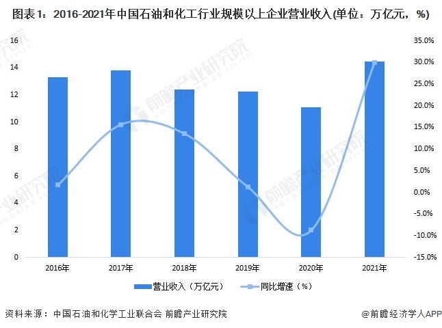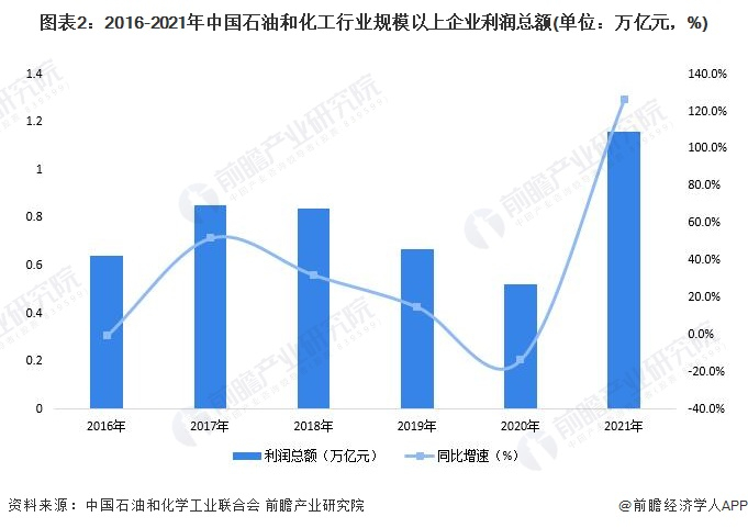 2021年石油和化工全行业实现营业收入14.45万亿元,同比增长30.0%;实现利润总额1.16万亿元,同比增长126.8%。营业收入和利润总额增速双双创造历史新高。