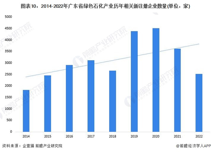 广东省绿色石化产业发展基础位居全国前列,企业营商环境优异,吸引了大量石化产业企业落地省内发展。根据企查猫查询数据显示,近年来,广东省绿色石化历年新注册企业数量保持在高位,2021年,广东省全年新增绿色石化产业注册企业达3613家;2022年,广东省绿色石化产业新增注册企业数量持续保持在高位,截至2022年10月12日,2022年广东省绿色石化产业相关新增注册企业数量达2524家。