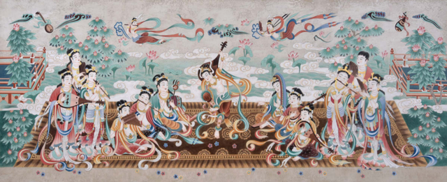 右下角的飞天引领着一架由三条龙所拉的车,众飞天在周围演奏着琵琶、箜篌、鼓、镲、笛子等乐器,周边还有飞天在散花,呈现出一派富丽堂皇的景象。