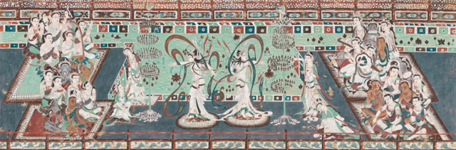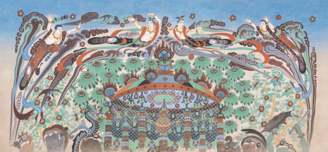 由飞天和流云组成一幅动态的画面,再加上绚丽的色彩,让美妙的西方极乐世界呈现在我们眼前。