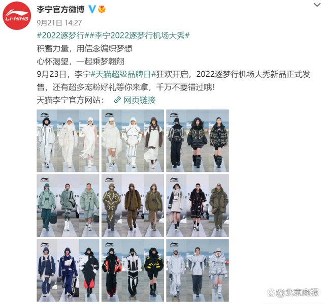 据报道,9月20日,李宁2022“逐梦行”主题大秀在湖北荆门漳河机场举行。大秀以飞行为主线,分为“御风飞行”“神工天物”“宇行飞天”3个主题板块。