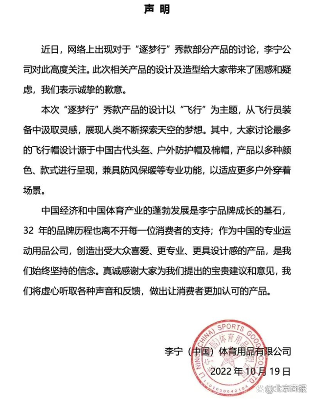 10月19日上午,李宁针对服饰争议发致歉声明:“逐梦行”秀款产品从飞行员装备中汲取灵感。飞行帽设计源于中国古代头盔、户外防护帽及棉帽。公司将虚心听取各种声音和反馈。