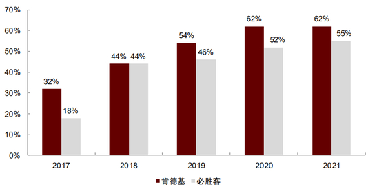 ►数字化工具应用:优化消费者体验、提升运营效率。百胜中国通过数字化技术及会员体系优化消费者体验并更加便捷触达消费者,如门店端通过手机点单、自助点单等方式提升点单效率;截至2021年底,公司会员数量超过3.6亿,2021年会员销售额在肯德基和必胜客总系统销售额中占比约60%。此外,百胜中国积极应用数字化和自动化技术以提升后台运营效率进而提升人效。