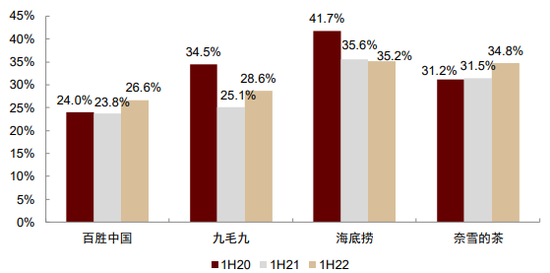 1H22压力测试下餐企降本控费成效明显。原材料成本方面,在行业面临通胀背景下,海底捞优化新品研发制作工艺以有效控制食材成本;太二年初锁定鲈鱼、酸菜等主要原材料价格,有效对冲行业整体原材料价格上涨。员工成本方面,海底捞通过根据单店翻台率调整员工数量、优化单店岗位编制并灵活用工等方式提升人效;奈雪的茶通过数字化技术(如自动排班系统、自动制茶机等)优化门店人效、降低员工成本刚性;太二、九毛九店均人数优化至27人左右。此外疫情期间百胜中国在全国范围内调整广告及促销、简化菜单并缩短营业时间以提效,并积极争取房东、政府等提供的临时补贴。