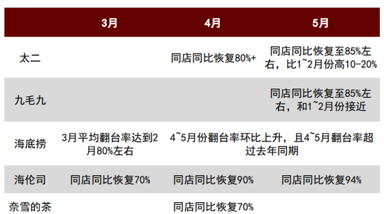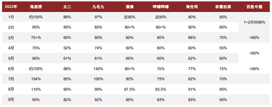 注:海底捞采取同店翻台率,其他采取同店收入;海底捞、海伦司、奈雪的茶22年同店恢复剔除了未营业门店;太二和九毛九22年同店恢复的对比基数为所有同店(包括营业和未营业)