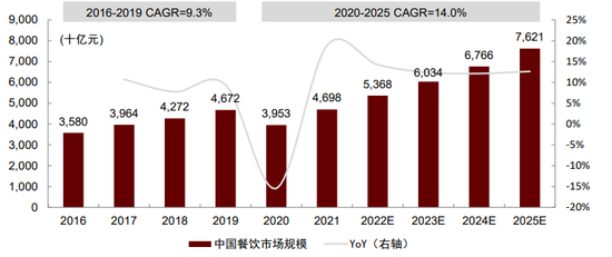 中国餐饮行业稳步增长。据弗若斯特沙利文数据,中国餐饮市场规模2019年达到4.7万亿元,2016-2019年CAGR为9.3%;受2020年初新冠肺炎疫情冲击,2020年市场规模同比下滑15.4%至4.0万亿元;2021年同比增长18.6%至4.7万亿元。弗若斯特沙利文预计中国餐饮市场规模2025年将达7.6万亿元,2020-2025年CAGR为14.0%。我们认为中国餐饮市场有望保持稳步增长,主要得益于:1)随着收入水平提升,在美好生活向往驱动下人们对于餐饮的品质和体验有更高的追求;2)随着生活节奏加快,人们在家做饭的频率降低,外出就餐和外卖需求持续提升;3)低线城市人口基数大,且高线城市注重品质、个性和体验的消费观念逐渐向低线城市渗透,下沉市场发展潜力可观。
