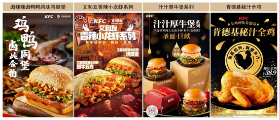 ►不断推出吸引眼球的新品。持续推出高质量新品能不断带给消费者新鲜感、增加消费频次、并维持和强化品牌势能。得益于强大的产品创新能力,百胜中国每年推出多款新品以吸引消费者,塑造其经久不衰的品牌吸引力:2021年百胜中国共推出500种以上的全新或升级产品,如肯德基新品汁汁厚牛堡系列;此外肯德基还与周黑鸭、文和友等合作伙伴合作推出多种新品。