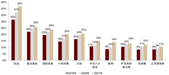 图表9:2019-2021年中国餐饮不同品类连锁化率