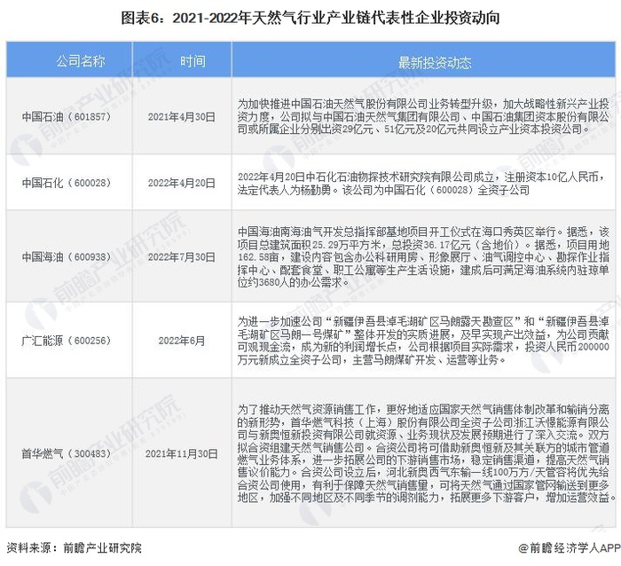 2021-2022年,天然气行业代表性企业的投资动向主要包括设立新公司、通过对子公司增资的方式投资天然气业务。天然气行业代表性企业最新投资动向如下: