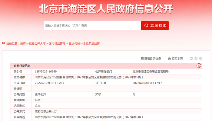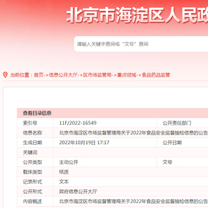 北京市海淀区市场监管局通报2022年第5期食品安全监督抽检信息
