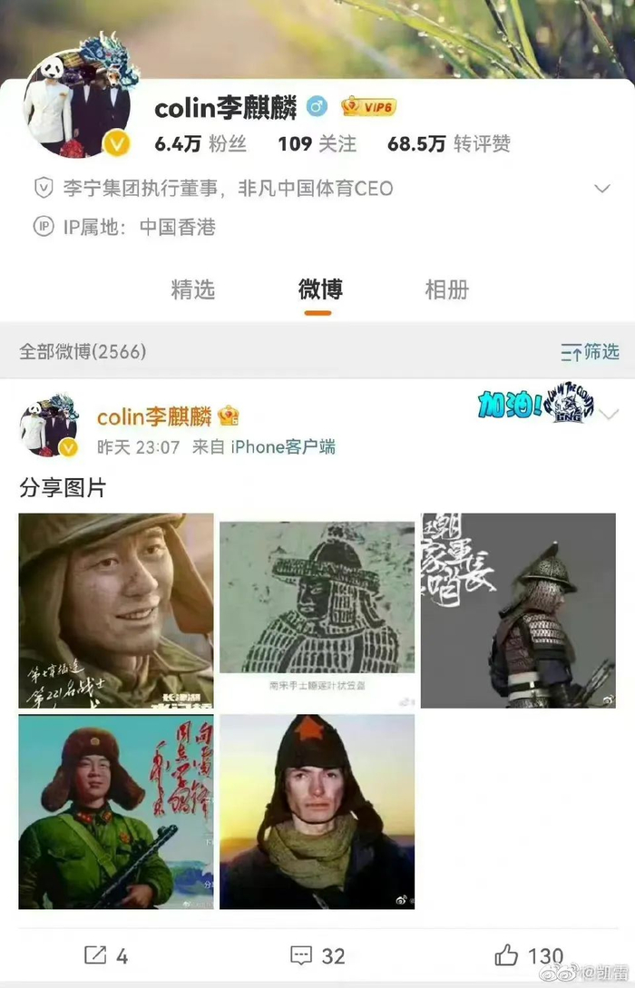 紧接着,微博实名认证为“李宁集团执行董事,非凡中国体育CEO”的“colin李麒麟”在自己的微博账号里上传了五张图片,包括电影《长津湖》剧照以及雷锋、保尔·柯察金等战士头戴军帽的照片。虽然其未发一言,但意图和“冯晔”无异。