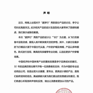 10月19日,在沉默几天后,李宁公司决定通过发声明来平息网友的怒火。面对网友的骂声一片,李宁在声明中表示:就此次相关产品的设计及造型给大家带来了困惑和疑虑,致以诚挚的歉意。