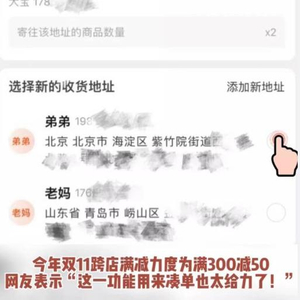 据测试,该功能最多可以添加20个地址,支持用户合并下单凑满减。对此,有网友称,给自己买买买的时候,还能把心仪好物分享给家人和朋友,省去改地址的麻烦,简直就是快乐加倍,“今年凑大额满减终于不愁拼单了!”也有网友表示,今年双11最大的奢望就是“我朋友们能把我的地址一起放进去”。