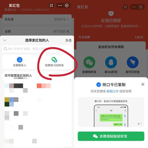 “但根本不是那么回事。”吱吱直言,“进入支付宝‘转账’功能‘红包’栏目之后,会给出支付宝联系人、‘给微信/QQ好友’两个发送选项,但选择‘给微信/QQ好友’之后,也只是包好红包之后,会生成一串口令让你‘发给微信好友’尽快领取。”