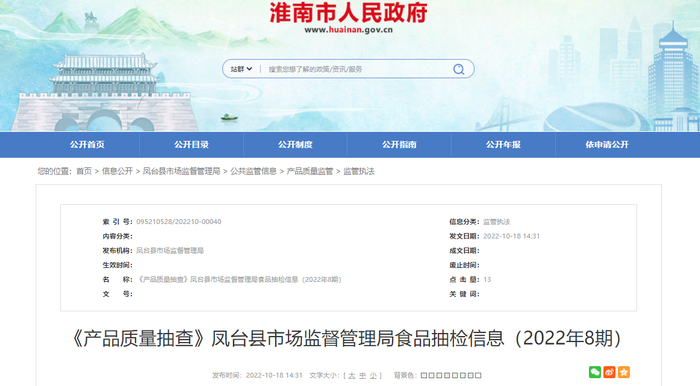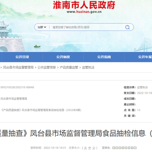 中国质量新闻网讯 据安徽省淮南市人民政府网站2022年10月18日消息,凤台县市场监督管理局发布食品抽检信息(2022年8期)。