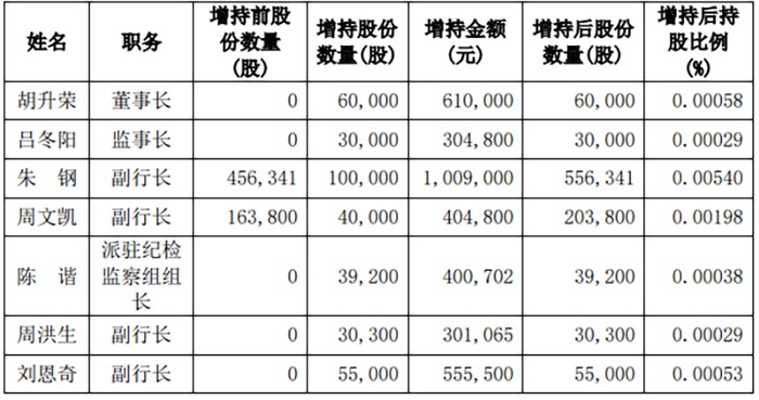 据此前公告,南京银行高级管理人员和部分董事、监事合计20人(以下简称“增持主体”)计划自2022年7月11日起3个月内以自有资金通过上海证券交易所交易系统集中竞价交易方式增持不少于845万元的人民币南京银行A股股份。