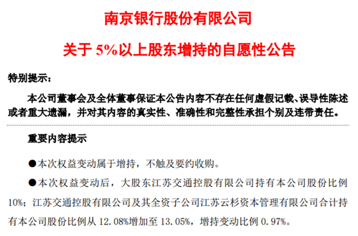 10月20日,南京银行发布公告称,大股东江苏交通控股有限公司(以下简称“江苏交控”)及其全资子公司江苏云杉资本管理有限公司(下称“云杉资本”)于2022年8月26日至2022年10月19日期间通过可转债转股方式和以自有资金通过上海证券交易所交易系统以集中竞价交易方式增持南京银行股份。