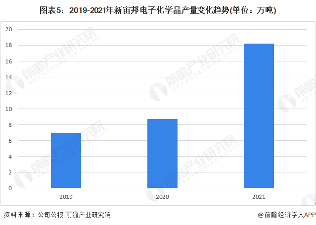 2019-2021年,新宙邦电子化学品产量呈上升态势。2021年,新宙邦电子化学品产量18.23万吨,同比上升108.58%。电子化学品生产能力持续提高。