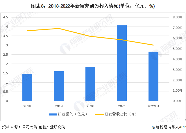 从研发投入角度看,2018-2022年,新宙邦研发投入总体呈现不断上升态势,总体来看,2018-2022年,新宙邦研发投入占营业收入的比重保持在5%以上的较高水平,但研发投入占比呈波动下降的态势。