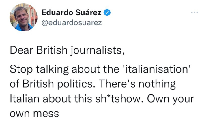 另一位名叫Educardo Suarez的记者则重新转发了一则他在10月15日就发表过的帖文,其内容是:亲爱的英国记者,别再谈论什么英国政治的“意大利化”了。英国现在的“狗屎局”可不是意大利特色的,管好你们自己吧。