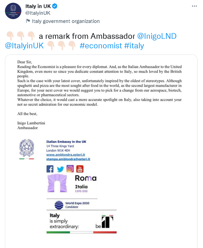 实际上,意大利驻英国大使馆也确实对此事表达了不满。在一份发表在社交网站上的声明中,意大利驻英国大使馆也是“嘲讽力”全开,先是阴阳怪气地对英国《经济学人》持续关心意大利表示了感谢,然后表示意大利的面条和披萨饼虽然是全世界最受欢迎的食物,但意大利作为欧洲第二大的制造国,同时还有航天科技、生物科技、制药业和汽车制造业,《经济学人》应该更准确地介绍英国,而不是像这起报道封面那样玩弄对意大利古老的刻板偏见。