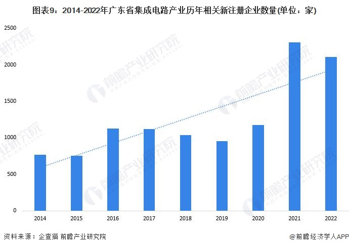 广东省集成电路产业发展基础位居全国前列,企业营商环境优异,吸引了大量集成电路产业企业落地省内发展。根据企查猫查询数据显示,近年来,广东省集成电路历年新注册企业数量保持在高位,2021年,广东省全年新增集成电路产业注册企业2311家,较2020年增加了1136;2022年,广东省集成电路产业新增注册企业数量持续保持在高位,截至2022年10月14日,2022年广东省集成电路产业相关新增注册企业数量达2109家。
