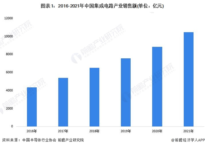 据中国半导体行业协会的数据显示,2017-2021年,中国集成电路产业销售额呈逐年上升的趋势,增长速度维持较高的水平。2021年是中国“十四五”开局之年,在国内宏观经济运行良好的驱动下,国内集成电路产业继续保持快速、平稳增长态势,2021年中国集成电路产业首次突破万亿元。根据中国半导体行业协会统计,2021年中国集成电路产业销售额为10458.3亿元,同比增长18.2%。
