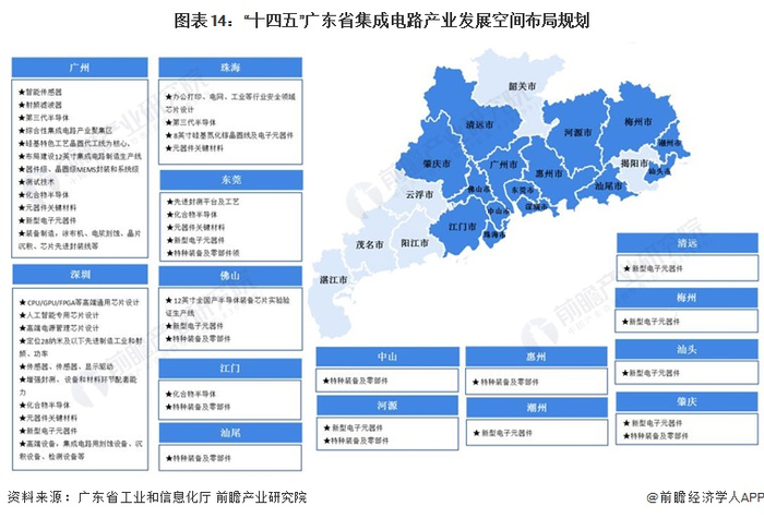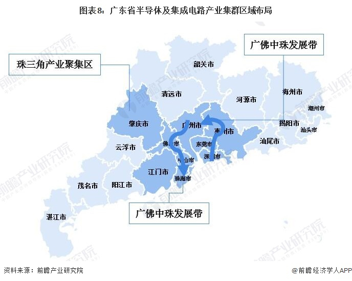 根据《广东省培育半导体及集成电路战略性新兴产业集群行动计划(2021-2025年)》,广东省集成电路产业将以广州、深圳、珠海为核心区域,积极推进特色制程和先进制程集成电路制造,加快培育化合物半导体,在晶圆制造工艺、FPGA、DSP、数模混合芯片、模拟信号链芯片、射频前端、EDA工具、关键IP核等领域实现突破,打造涵盖设计、制造、封测等环节的全产业链。以深圳、汕头、梅州、肇庆、潮州为依托建设新型电子元器件产业集聚区,广深珠莞等多地联动发展化合物半导体产业。佛山、惠州、东莞、中山、江门、汕尾等城市依据各自产业基础,在封装测试、半导体材料、特种装备及零部件、电子化学品等领域,积极培育发展产业龙头企业,推动建设半导体及集成电路产业园区,形成与广深珠联动发展格局。