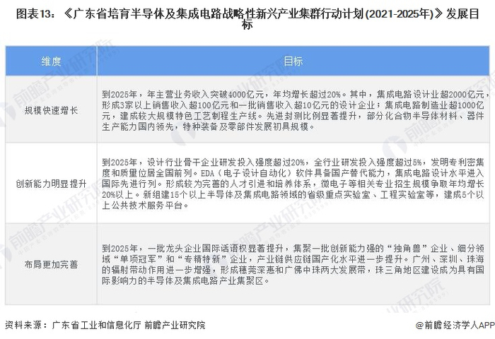《广东省培育半导体及集成电路战略性新兴产业集群行动计划(2021-2025年)》提出以广州、深圳、珠海为核心区域,积极推进特色制程和先进制程集成电路制造,加快培育化合物半导体,在晶圆制造工艺、FPGA、DSP、数模混合芯片、模拟信号链芯片、射频前端、EDA工具、关键IP核等领域实现突破,打造涵盖设计、制造、封测等环节的全产业链。