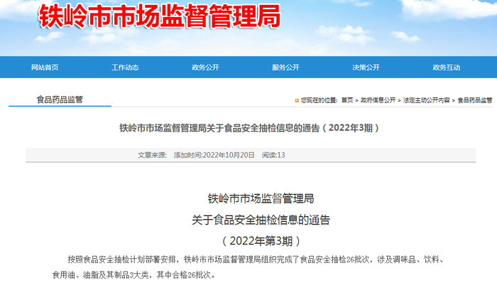 辽宁省铁岭市市场监管局抽检食品26批次 全部合格