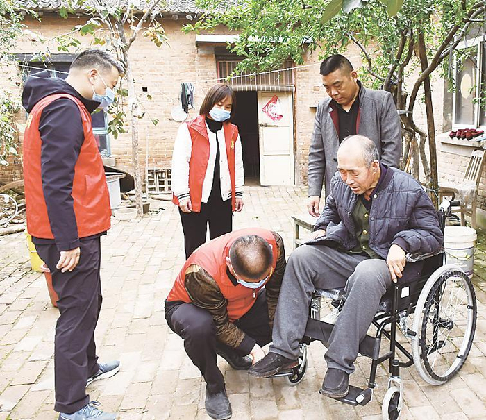 10月14日,广平县人民检察院办公室党支部联合县残联党支部到辖区南韩镇北盐池村开展志愿服务活动。党员干警和县残联工作人员先后到老党员、残疾人家中,帮助他们打扫庭院,并送去了慰问品和助残器具。图为身穿志愿者“红马甲”的干警为群众试用新轮椅。 张昭兴 胡敬辉 摄