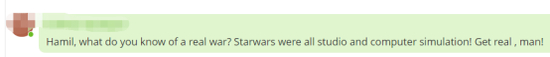“哈米尔,你对真正的战争了解多少?《星球大战》都是在工作室和电脑上模拟的!现实点吧,伙计!”
