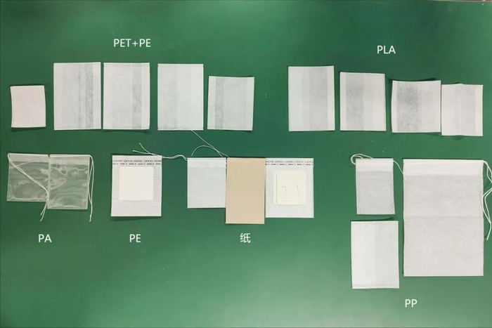 市场上的茶包主要分为六种不同的材质:普通塑料无纺布(PE(聚乙烯)、PP(聚丙烯)、PA(尼龙/聚酰胺)、PET+PE共混(聚对苯二甲酸乙二醇酯和聚乙烯共混)、可降解塑料无纺布(PLA(聚乳酸))和纸。