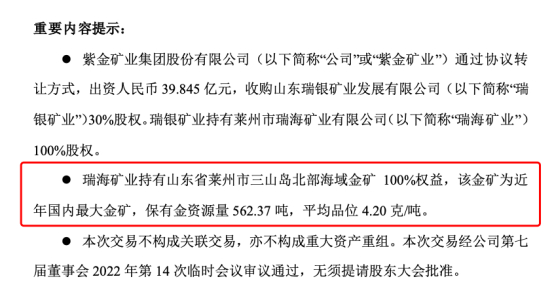 紫金矿业10月12日发布的公告显示,其拟收购的海域金矿是近年国内最大的金矿之一,保有金资源量562.37吨,平均品位4.2克/吨。