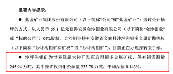 21日晚,紫金矿业公告,公司通过公开摘牌的方式,以59.1亿元获得安徽金沙钼业有限公司84%股权,并于10月21日与转让方签订《产权交易合同》。金沙钼业持有安徽省金寨县沙坪沟钼多金属矿勘探权,目前正在办理探转采手续。