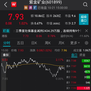 10月21日收盘,紫金矿业A股涨1.02%报7.93元/股,市值2035亿元。