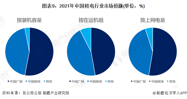 目前,我国核电行业的龙头上市公司是中国广核、中国核电,这两家上市公司的核电业务营收均在500亿元以上,其他上市公司的核电业务份额则相对较小。其中,2021年,按在运机组数量来看,中国广核的市场份额达47%,中国核电的市场份额达45%;按在运装机容量来看,中国广核的市场份额达53%,中国核电的市场份额达44%;按核电上网电量来看,中国广核、中国核电的市场份额分为为53%、42%。