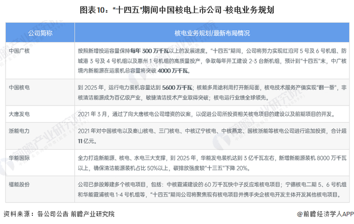 根据“十四五规划和2035年愿景目标纲要”,“十四五”期间,我国核电运行装机容量达到7000万千瓦。据此,核电行业的龙头企业——中国广核、中国核电也相应提出了其十四五发展目标,中国广核表示将保持每年300万千瓦以上发展速度,中国核电表示每年将保持3GW以上的发展速度。此外,核电企业的其他上市公司也明确了其核电业务的发展布局: