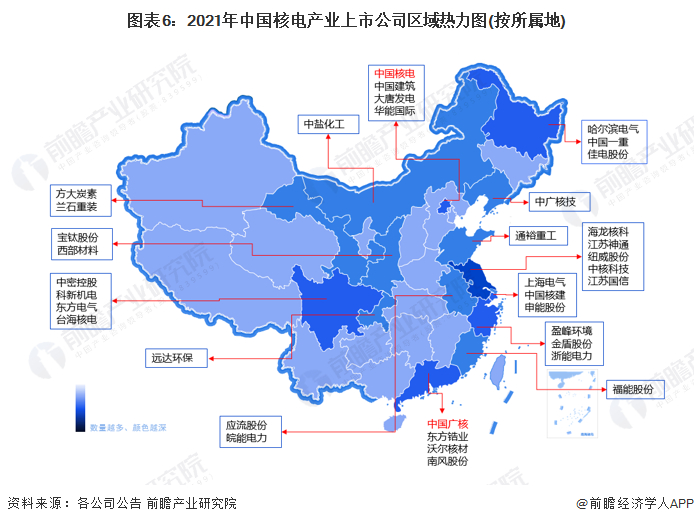 核电行业的上市公司中,中国广核、中国核电的核电业务布局最广,这两家企业重点布局在长三角与珠三角地区。其他上市公司则基本通过参股方式参与核电业务的经营。
