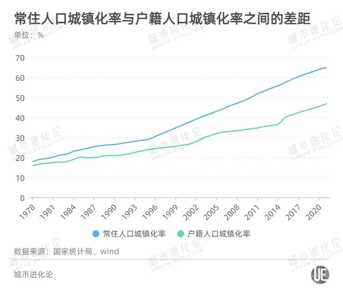 不过,一条“鸿沟”依然横亘在城乡之间。对比64.72%的常住人口城镇化率,户籍人口城镇化率却仅有46.7%。二者之间超过18个百分点的跨度,意味着依然有超过2亿人“漂泊”在城乡之间,造成日常居住、生活空间与户籍地分离。